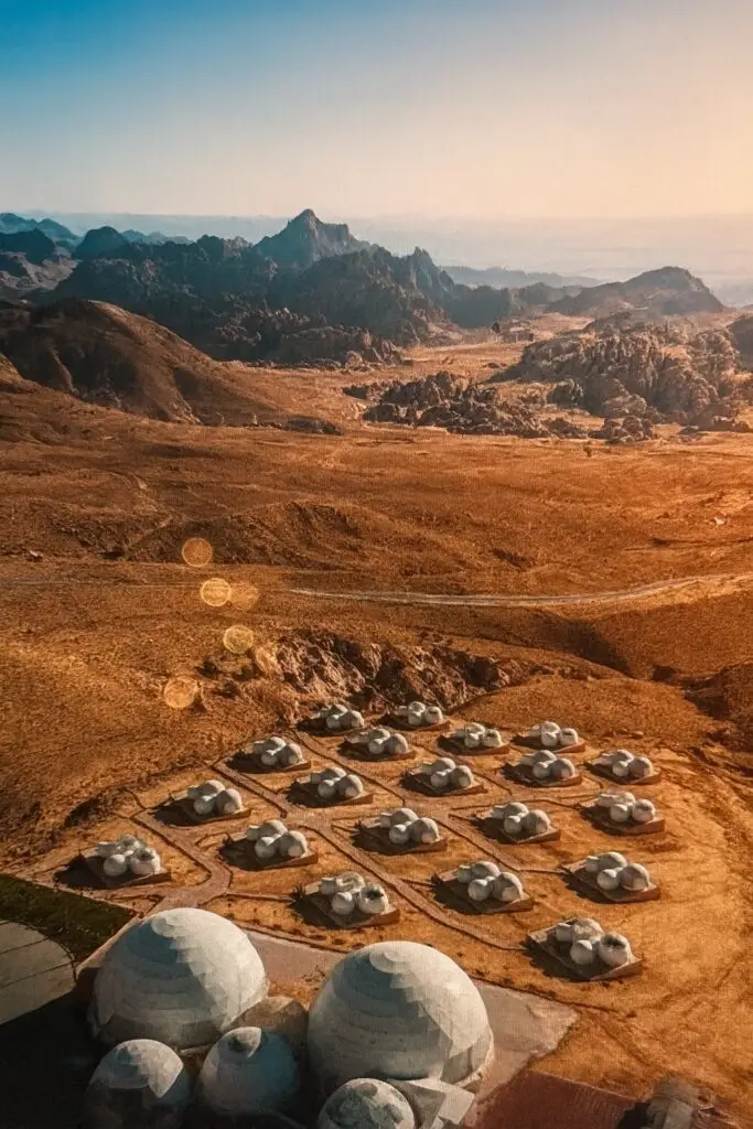 Each suite is a transparent dome — a “bubble” that blends futuristic design with Bedouin warmth. Inside, modern comforts meet minimalist elegance: a king-size bed, soft lighting, gentle curves, and panoramic glass windows that make you feel part of the desert itself.