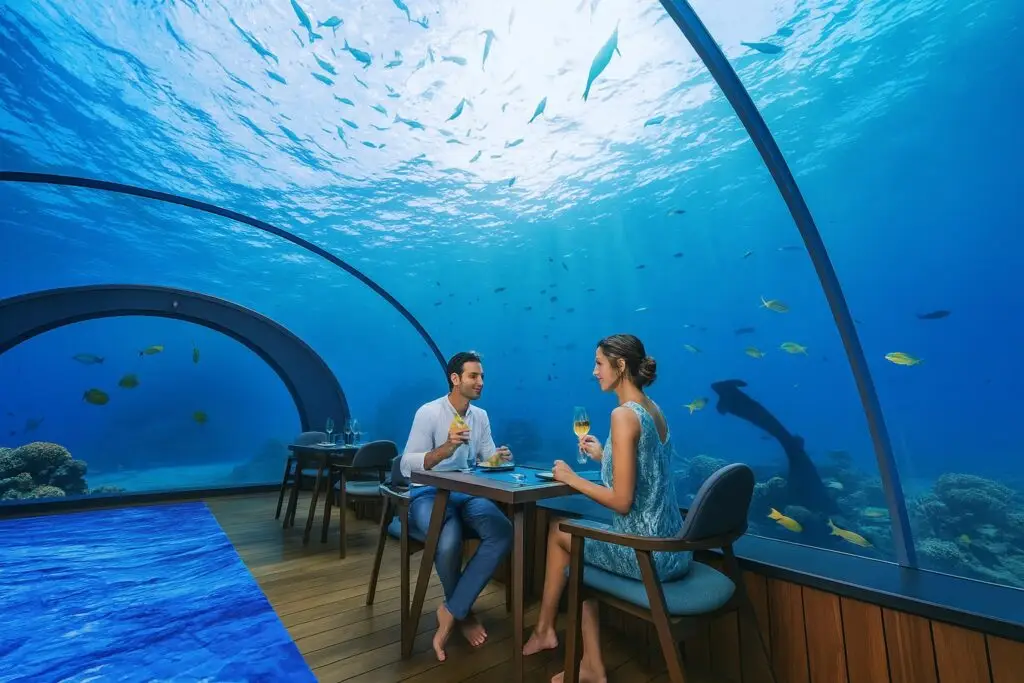 As you descend the spiral staircase into the glass dome, you’re transported into another world: reef fish glide past, corals shimmer in the soft light, and every bite feels like magic. The restaurant offers a multi-course tasting menu, paired with fine wines.