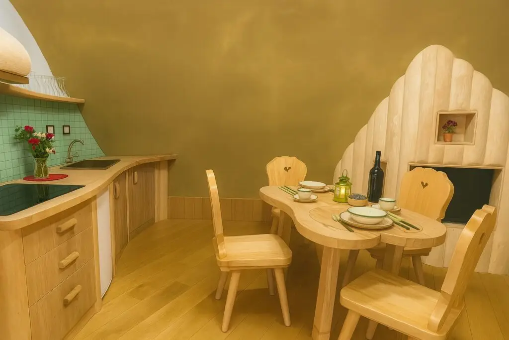 The kitchen is fully equipped with a sink, stovetop, and fridge — plus charming mugs, plates, and utensils that suit the hobbit theme. The dining area features a custom-made wooden table and chairs with heart-shaped backs, and every detail feels intentional and lovingly made.